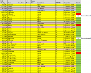 In conclusion, we are attaching (1) a map of the Governor’s races won by the Republicans and the Democrats, and (2) a “report card” showing how good our predictions were – in this case, we correctly called 32/37 (or 86%) of the Governor’s races.