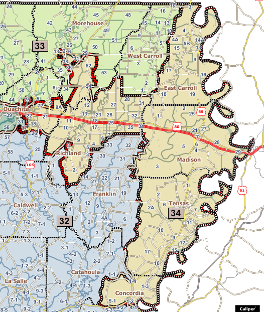 District 34 contains all or part of six northeast Louisiana parishes. Not only is there a racial split in the district, but there is also a rural/urban one. The “urban” area is the portion of the district in Ouachita Parish in the black majority precincts in the southern portion of Monroe. This portion of the district casts 53% of the district vote and is 76% black by voter registration. The remainder of the district stretches along the Mississippi River from the black portions of Ferriday in Concordia Parish to the Arkansas line. Connecting these two areas is a section of Richland Parish that is generally north of I-20. This “rural” section of the district is 56% black and is where the remaining 47% of the vote is cast.