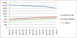 What all of this means going forward is that, given voter registration trends thus far, Republican voter registration statewide will approach 30% in the near future. The number of registered Independents will likely overtake the number of Republicans within the next decade and peak at about 35%, while Democratic voter registration will probably stabilize at about 35%. In other words, you will have a situation where the bloc of those registering as Independents will truly be the “swing vote”, while as time goes on, those registering as Democrats will be those who support the Democratic ideology – essentially, the “conservative Democrat” will disappear.