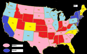 (2) Lean Democratic/Clinton or lean Republican/Trump (light blue/red) – If no polls have been conducted within the last 7 days for that state, a 2012 Clinton (or Trump) percentage between 53-59% gets this rating. If polls have been conducted, a Clinton (or Trump) average percentage of 49% or less with a lead of between 3-10 points will get this classification;